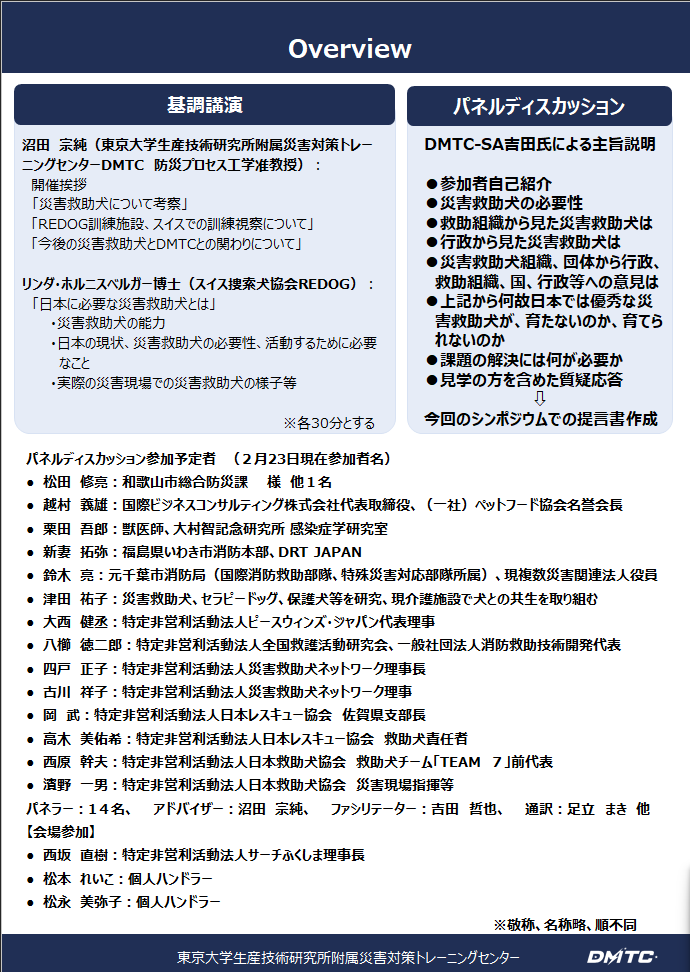 行政、救助組織、救助犬団体、研究者などのパネリストが登壇し、現場支店と組織運営の観点から議論を深めます。
