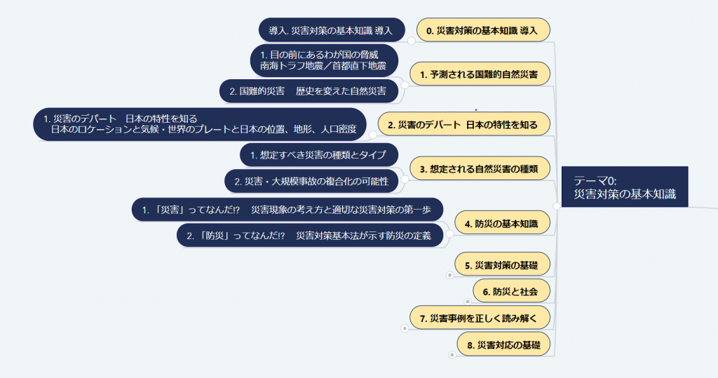 2021.05.29 未分類 DMTCの基礎コース講義体系図 DMTCの基礎コースの体系図です。拡大して表示する場合にはMindMeisterのDMTC基礎コースを訪れてください。 もっと大きく見たい!場合は以下をクリックしてください。 過去に開催された「効果的な応援・受援に向けた災害対応の標準化研究会 (BOSS研)」 前の記事 保護中: 愛媛県 令和3年度防災対策研修資料 令和3年6月1日(火)実施 次の記事