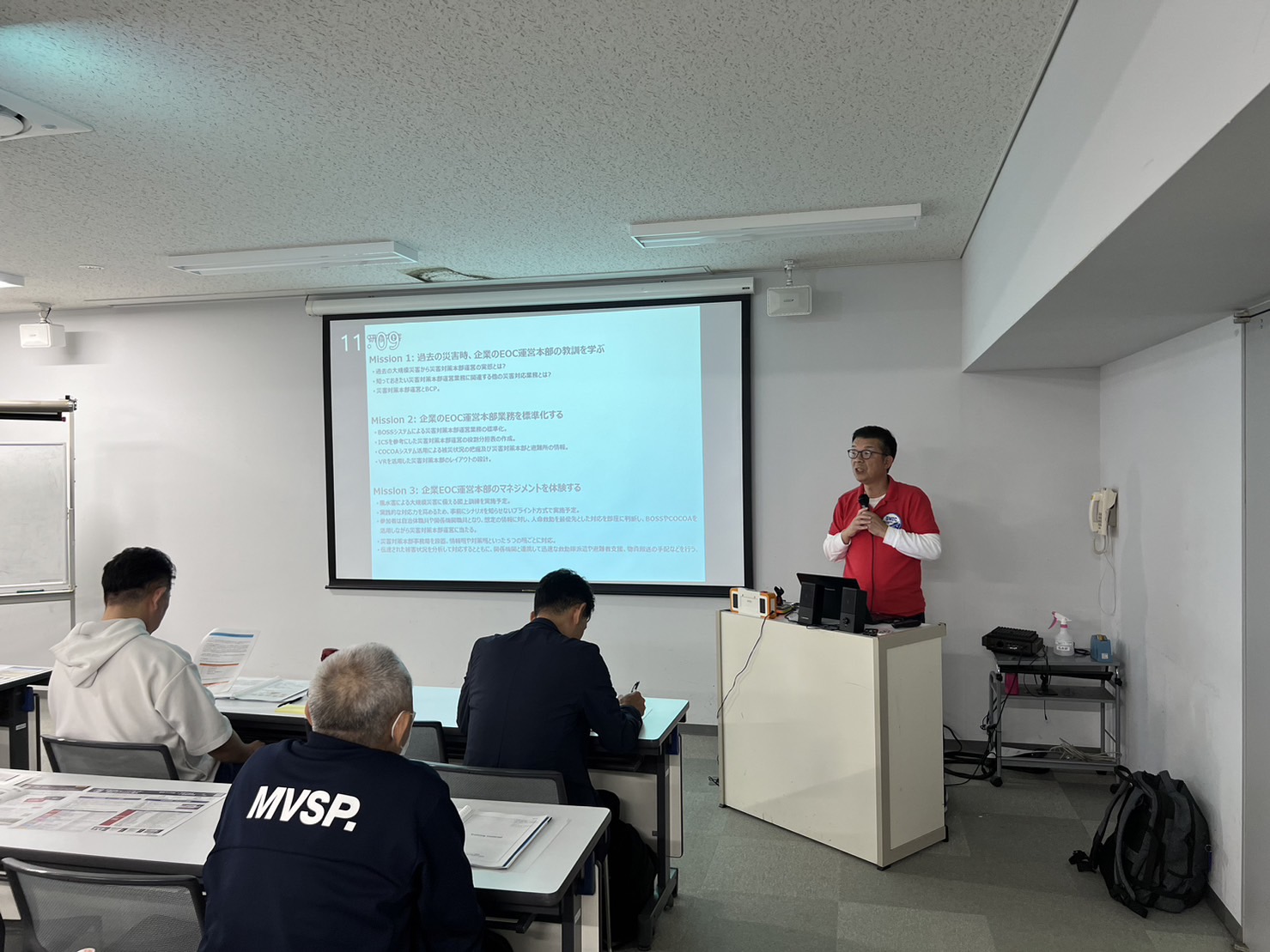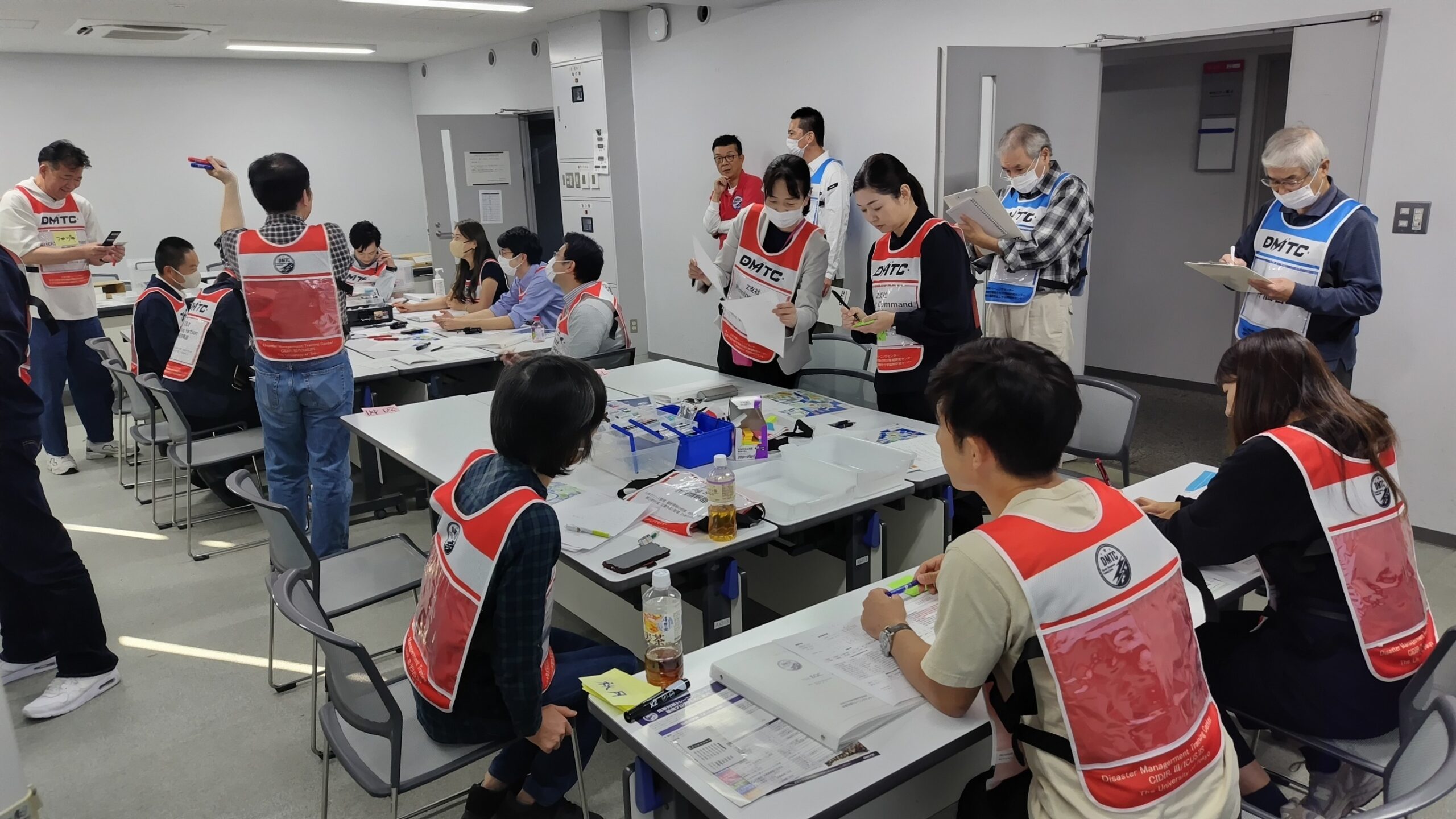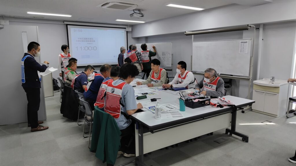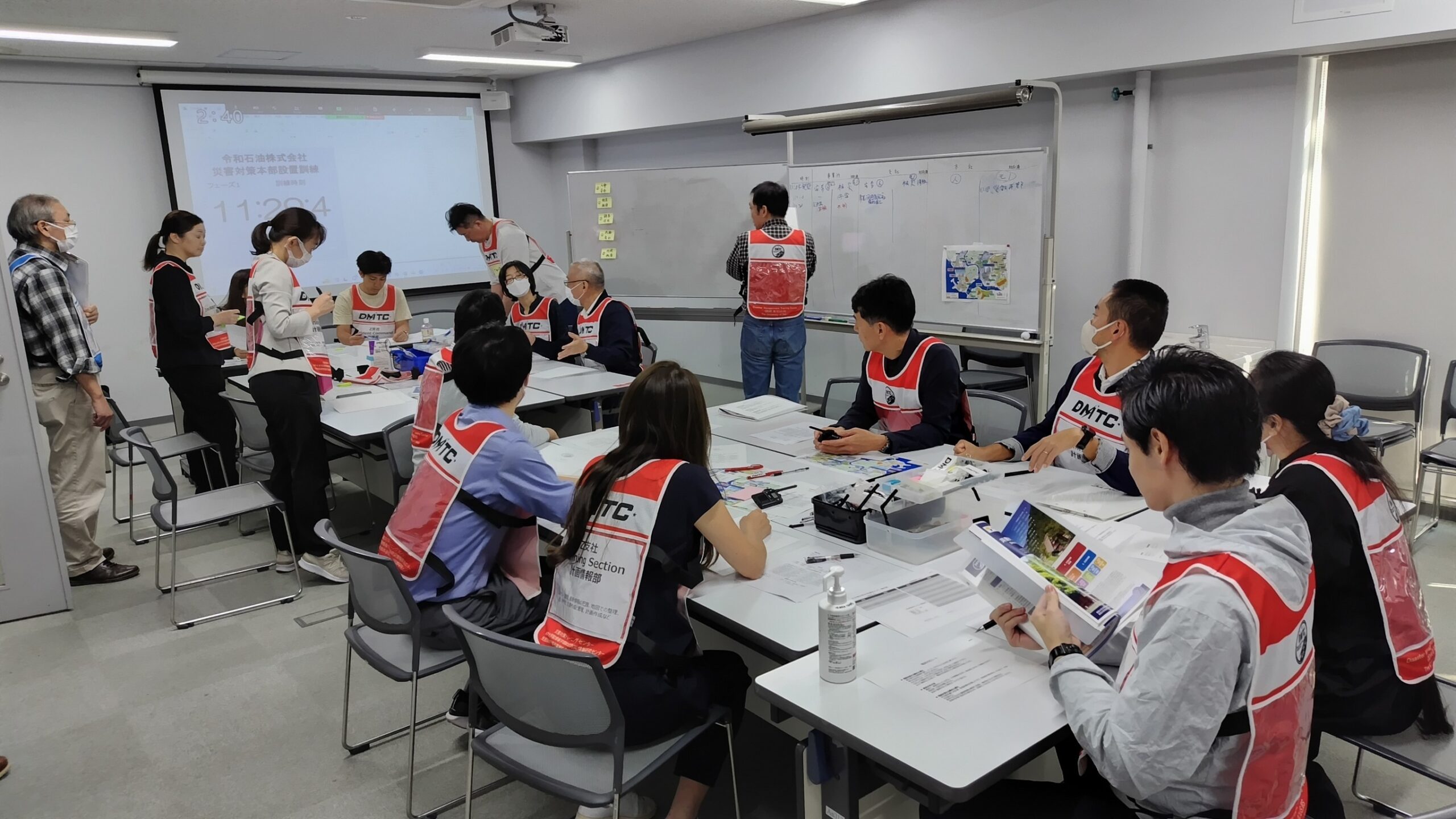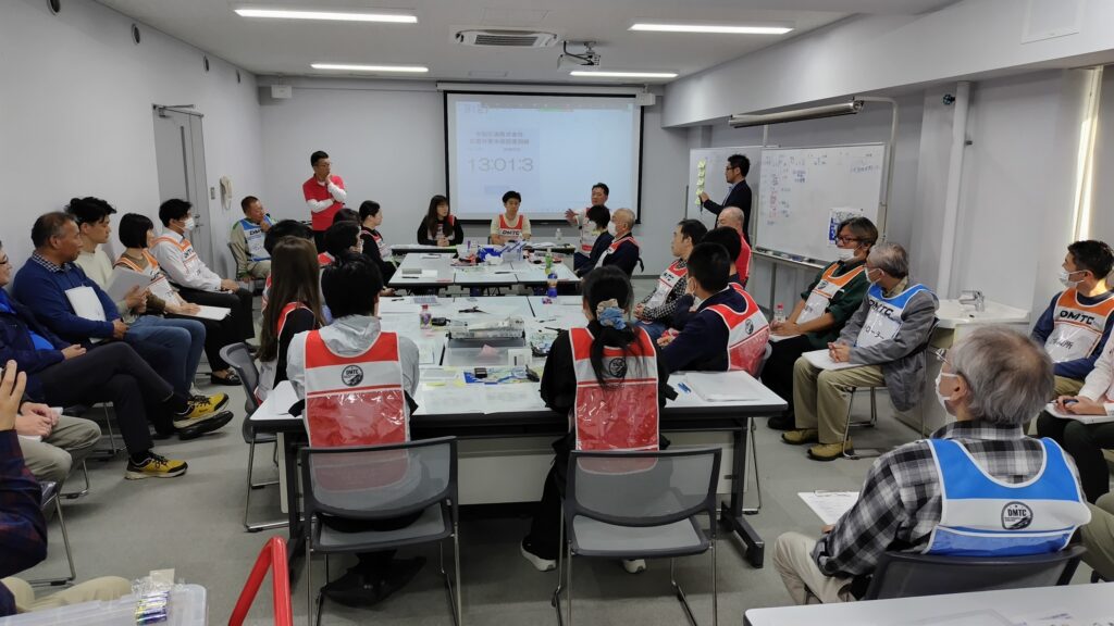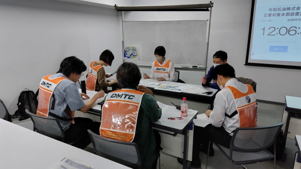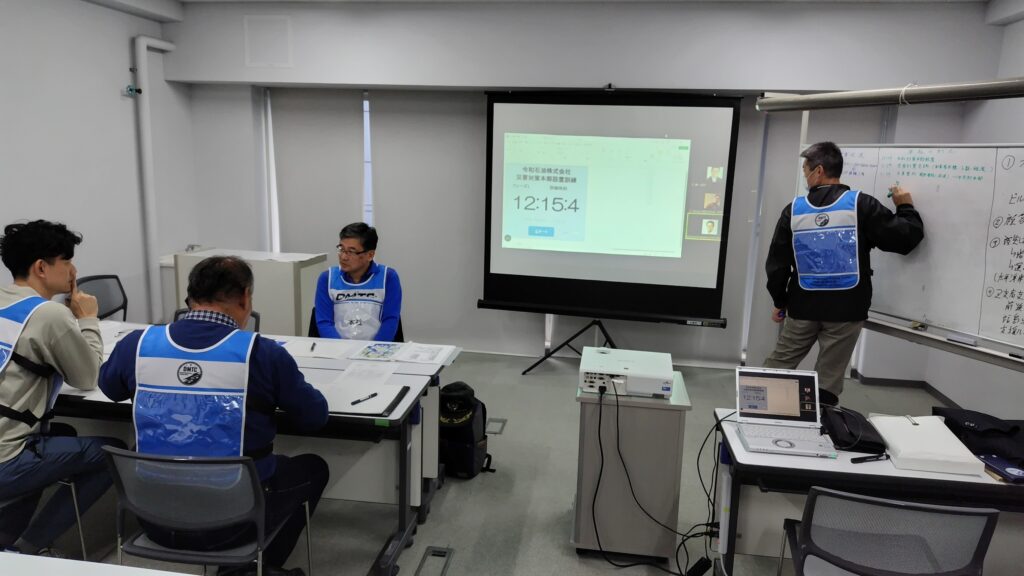 午後には、 災害対策本部における情報伝達を主とした運営の演習を行いました。今回は、企業向けのシナリオを新規作成し、本社・支社・事業所の連携体制などを踏まえた形式としました。