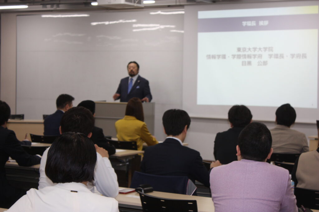 開講式では、総長からの激励の言葉に加え、目黒公郎 情報学環長から本プログラムの趣旨や今後の展望についての説明も行われ、履修者にとって今後の学びに向けた意識を高める貴重な機会となりました。