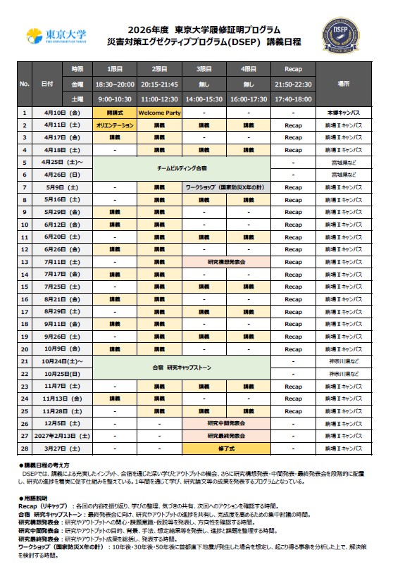 DSEPでは、講義による充実したインプット、合宿を通じた交流、深い学びとアウトプットの機会、さらに研究構想発表・中間発表・最終発表会を段階的に配置し、研究の進捗を着実に促す仕組みを整えている。1年間を通じて学び、研究論文等の成果を発表するプログラムとなっている。