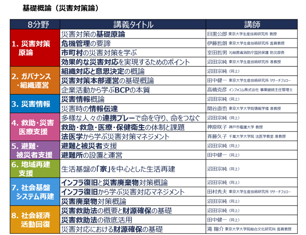 DMTCでは、災害対策を体系化するために、8つの研究・教育分野を設定しています。災害対策論では、各分野から基礎的な内容を取り上げます。