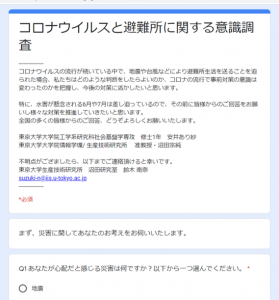 コロナウイルスの流行が続いている中で、地震や台風などにより避難所生活を送ることを迫られた場合、私たちはどのような判断をしたらよいのか、コロナの流行で事前対策の意識は変わったのかを把握し、今後の対策に活かしたいと思います。