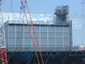2号機、3号機間の通路から見る2号機建屋