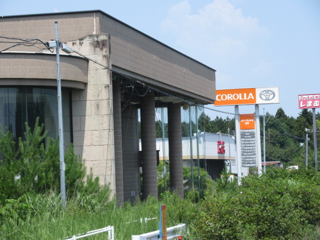 展示室のガラス張りが割れたままになっているトヨタのディーラー