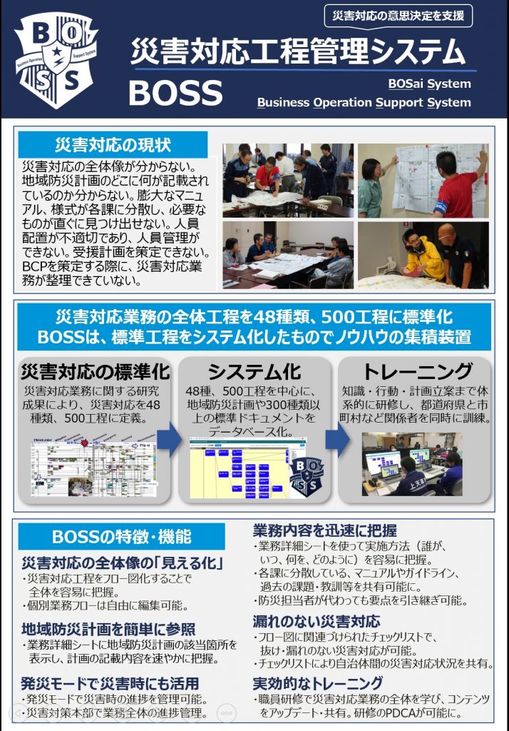 2019.09.24 BOSS 災害対応工程管理システムの紹介 災害対応工程管理システムBOSS (Business Operation Support System, BOSai System)の活用 導入に関するお問い合わせを多くいただいています。そこでパンフレットを作成いたしました。 ご参考にして頂けると幸いです。 総務省作成のビデオ BOSSの紹介 DMTCモニタートレーニングの放送(NHK静岡) 前の記事 令和元年度 ひょうご防災リーダー講座 次の記事
