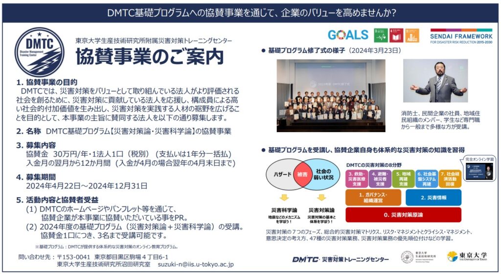 - 2024年度の基礎プログラム(災害対策論+災害科学論)の受講。協賛金1口につき、3名まで受講可能です。